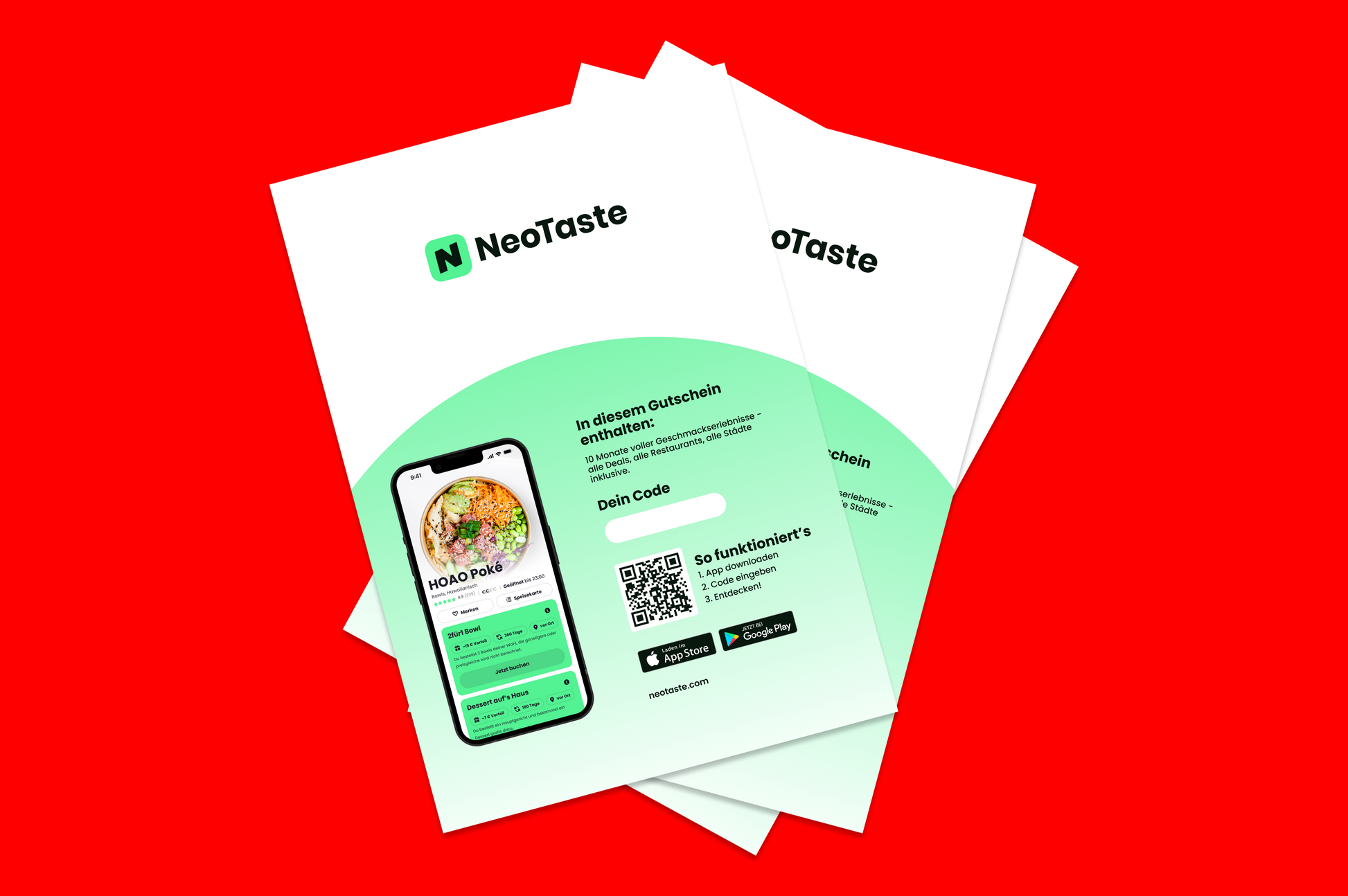 Du erhältst eine PDF mit einem individuellen Code. Dieser Code berechtigt zu einem 10-monatigen Zugang zu allen Deals, Restaurants und Städten von NeoTaste. Beginne jetzt deine Restaurant-Entdecker-Reise!